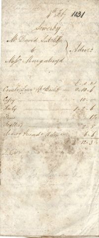 This document refers to the sale of two cottages on High Street backing onto the old Millpond. Today, this is the two-storey section of 76-77 High Street. In 1831, the three-storey part of this property had not been built. A small garden occupied the space now occupied by the three-storey part of the building. In 1831, the two cottages were unoccupied and in a poor state of repair. The previous occupants are named as Betty Greenwood and Mary Horner. The properties were owned by David Sutcliffe of Mytholmroyd who was a Butcher?. He sells the cottages to Hartley and John Murgatroyd, Cornmillers for a sum of £25. This transaction is witnessed by Charles Claye and signed off by the Deputy Steward Fred Lumb. The cover sheet to the left shows the charges incurred for this transaction.